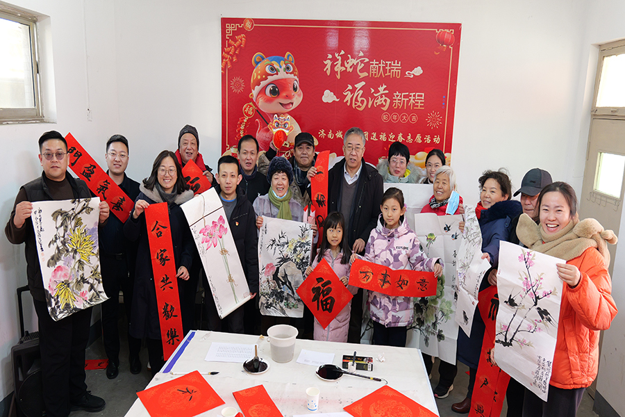 為深入貫徹中央社會工作會議精神,弘揚傳統文化,豐富社區生活,1月10日,匯通集團第一支部聯合濟南市文聯、濟南市美協共同走進千佛山西路社區、歷園新村社區開展“迎新送?!蔽乃嚮菝穹栈顒印?活動中,濟南市文聯副主席、濟南市美協主席李慶杰,山東省文聯委員、濟南市美協副主席兼秘書長張春艷,濟南市美協副主席張波、吳疆、李軍,濟南市書協副秘書長任清,青年作者楊淑涵、王文秀等書畫家現場揮毫潑墨,為社區群眾書寫春聯、福字,并捐贈寓意美好的書畫佳作,以筆墨為媒,將新春的祝福與溫暖傳遞給每一位社區群眾。 居民們手捧著火紅的春聯,心中滿載著“福”氣,臉上洋溢著幸福的笑容,一幕幕歲月靜好在這個瞬間凝結成時光印記,溫暖