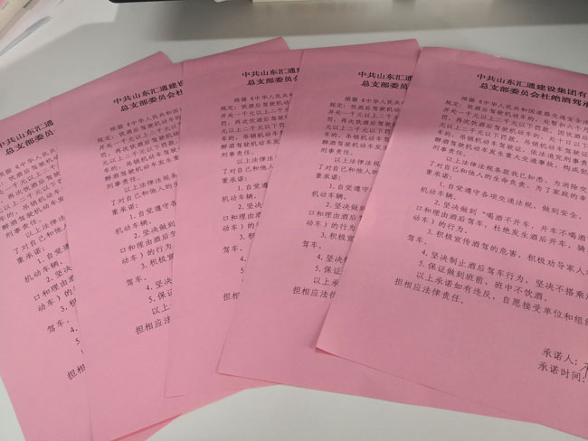 為進一步提高分公司全體黨員干部自覺遵守黨的紀律和國家法律法規意識,有效遏制酒后駕車問題發生,近日,匯通公司黨總支組織簽訂《杜絕酒駕承諾書》。